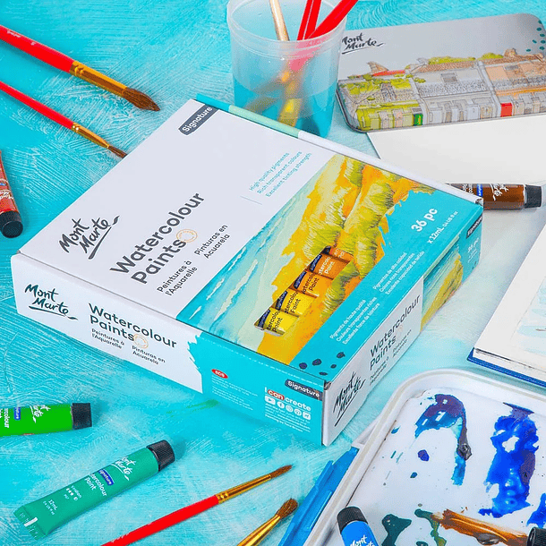 Descubre el arte de la acuarela con el set Signature de 36 colores Mont Marte. Diseñado tanto para principiantes como para artistas avanzados, este set ofrece pigmentos vibrantes y de alta calidad, con un gran poder colorante y una transparencia excepcional. Sus tonos se mezclan fácilmente, permitiendo superposición, aguadas, veladuras y más, lo que brinda una libertad creativa total. Cada tubo contiene 12 ml de acuarela, abarcando una amplia gama de colores fríos y cálidos como azul ultramar, magenta, ocre amarillo y negro marfil. El acabado translúcido permite trabajar por capas, logrando profundidad y efectos sutiles. Además, su fórmula a base de agua facilita la limpieza. Ideal para papel de acuarela o lienzo, este set es perfecto para experimentar técnicas, explorar combinaciones y dar vida a tus ideas. Ya sea para ilustraciones detalladas o expresiones abstractas, este completo set te acompañará en cada pincelada.